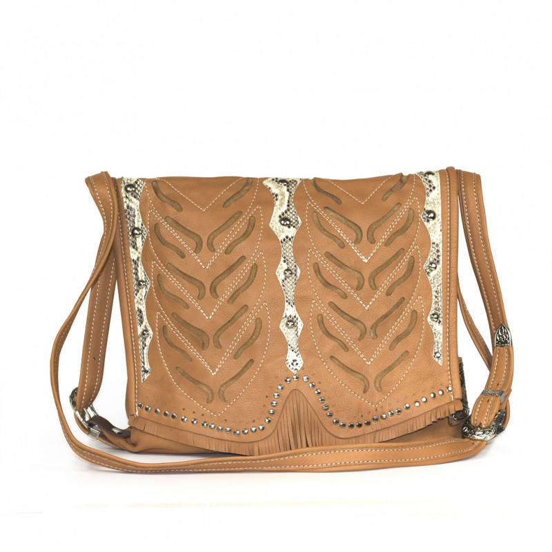 Bolso al hombro original Hector con motivo en piel perforada y bajadas en piel de pitón a juego con las botas y los cinturones Indianino.
